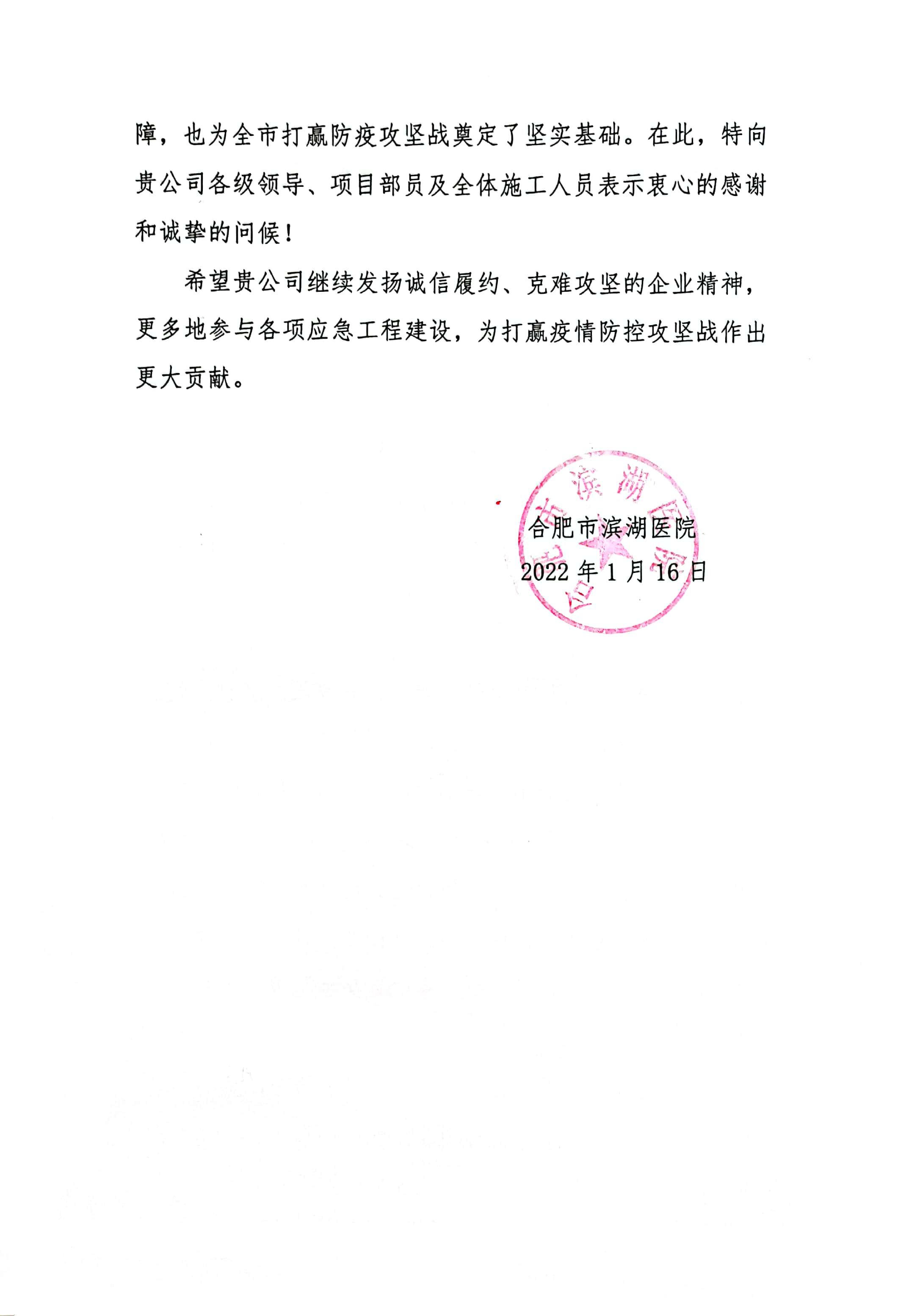 近日,安徽安裝公司收到合肥市濱湖醫院表?yè)P信,信中高度贊揚公司濱湖醫院感染病區及發(fā)熱門(mén)診應急改造工程設計施工一體化方艙醫院項目克服重重困難,縮短工期,一個(gè)月的時(shí)間內按期交付使用。該項目充分展現了安徽安裝作為國有企業(yè)擔當履責的社會(huì )責任,為合肥市打贏(yíng)防疫攻堅戰奠定了堅實(shí)基礎。